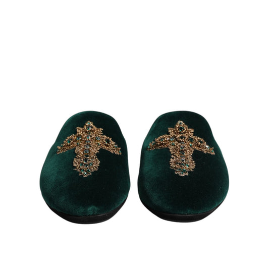 Dolce & Gabbana Green Velvet Cross Embellished Slippers Shoes