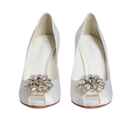 Dolce & Gabbana White Crystals Peep Toe Satin Pumps Shoes