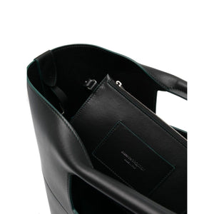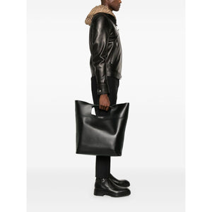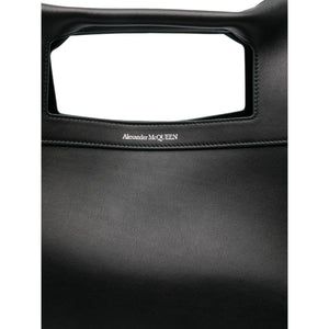 leather logo print tote bag from Alexander McQueen featuring black, calf leather, smoothing finish, stripe detailing, logo print to the front, bow detailing, two top handles, single top handle and main compartment. The Square Bow leather handbag Size and Fit - Width 17,32 in / 44 cm Height 15,35 in / 39 cm Depth 5,91 in / 15 cm Strap 16,54 in / 42 cm