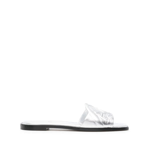 silver-tone calf leather smooth grain metallic finish square open toe logo-embossed strap branded leather insole flat leather sole slip-on style Seal leather sandals Size and Fit - Heel 0,6 in / 1,5 cm