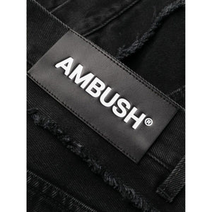 frayed-trim loose jeans from AMBUSH featuring black, cotton, denim, frayed detailing, mid-rise, belt loops, concealed fly and button fastening, classic five pockets, logo patch to the rear and straight leg. High waisted denim jeans Size and Fit - This piece fits true to size. We recommend you get your regular size. Model is 1,84m / 6ft 1in wearing size 32 (WAIST CM)
