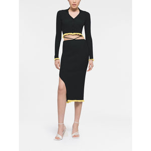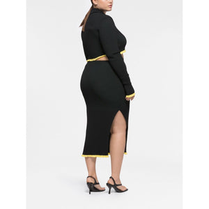 x Ester Manas ribbed cropped cardigan from AZ FACTORY featuring black, ribbed knit, V-neck, spread collar, front button fastening, long sleeves, contrasting border, scallop hem and cropped. Cropped top Size and Fit - This piece fits true to size. We recommend you get your regular size. Model is 1,75m / 5ft 8in wearing size S