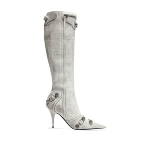 Cagole point-toe boots from BALENCIAGA featuring optical white, lambskin, pointed toe, stud embellishment, zip details, silver-tone hardware and stiletto heel. Le Cagole leather boots Size and Fit - Heel 9 cm