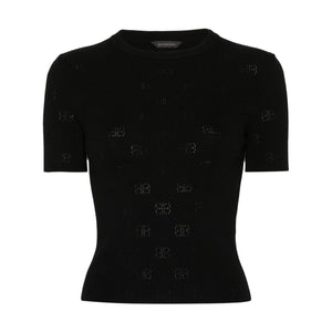 black wool blend fine knit BB pattern pointelle knit crew neck short sleeves straight hem Open-knit wool top