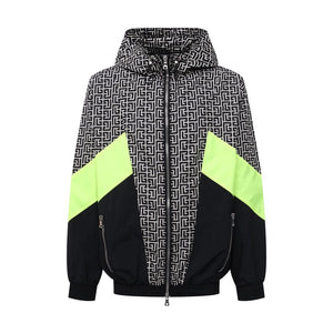 Elevate your outerwear with this striking Balmain nylon jacket, showcasing a bold geometric pattern print that commands attention. Neon yellow stripes race down the sides and sleeves, adding a vibrant pop of color. Function meets high fashion with a front zip fastening, hood with drawstring, and secure front zip pockets – all designed to keep you stylishly protected against the elements. Crafted with precision, it’s a testament to Balmain’s commitment to luxury and cutting-edge design.