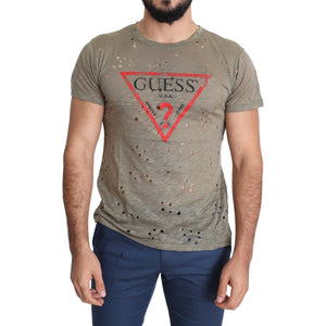 Guess Brown Cotton Stretch Logo Print Men Casual Perforated T-shirt