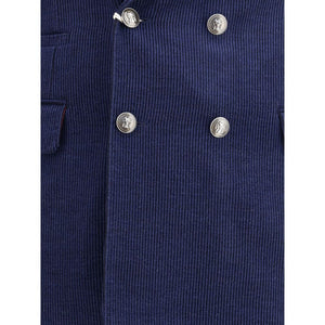 Brunello Cucinelli wool Suit elegant and sophisticated, ideal for a formal look or for refined occasions. The wool blazer jacket with corduroy workmanship features a front button closure, three flap welt pockets on the front and a slit pocket on the chest. The peak lapel adds a distinctive and classy touch. The matching trousers, also made of wool, feature a front zip and button closure, two side slash pockets, two back welt pockets and belt loops that allow for a tailored fit. The monochrome pattern enhances the line of the suit, combining sartorial elegance and contemporary comfort.