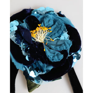 Gorgeous brand new, 100% Authentic Dolce & Gabbana statement necklace. This stunning choker-style necklace features a bold oversized floral appliqué centerpiece in rich shades of blue, detailed with sequins, layered fabric petals, and intricate embroidery. The adjustable black velvet band adds a luxurious contrast, finished with gold-tone metal chain extenders and a lobster clasp for a secure fit. A delicate faux pearl drop at the back adds an elegant finishing touch.