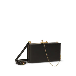 black calf leather smooth grain gold-tone hardware snap-fit fastening detachable chain-link shoulder strap single detachable top handle internal logo stamp partitioned compartment Eva leather clutch Size and Fit - Width 8,66 in / 22 cm Height 4,53 in / 11,5 cm Depth 1,77 in / 4,5 cm