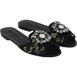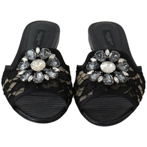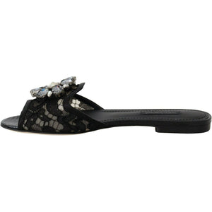 Dolce & Gabbana Black Taormina Lace Slides Crystals Flats Shoes