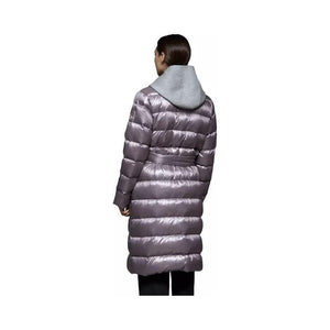 People Of Shibuya long quilted down jacket in ultralight technical fabric with “pearl finish” treatment. 90/10 goose down filling. Inside bib snap closure, outside closure with padded belt. Invisible external pockets with zipper closure. Applied 3D lycra logo in color tone. Hood and bib made of 70/30 wool. High-visibility reflective details.
