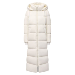 Infuse your winter with the epitome of Italian elegance with this Herno long down jacket. Crafted for the woman who embraces sophistication without sacrificing comfort, this sleek white nylon number boasts sumptuous feather padding and a convenient zip fastening. The refined hood with drawstring provides adaptable protection, while the ribbed wool cuffs lend a touch of tailored charm. Embrace the cooler months in style with a Herno original, where luxury meets practicality.