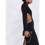 Black open-back high-neck cut-out evening gown from Mônot featuring open back, cut-out detailing, high neck, concealed rear zip fastening, long sleeves, rear slit and floor-length. Slit detail silk crepe long dress Size and Fit - This piece fits true to size. We recommend you get your regular size. Model is 1,75m / 5ft 8in wearing size 4 (US)