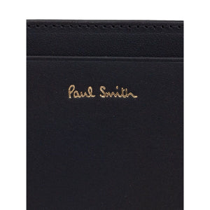 Paul Smith Signature Stripe leather card case with black card slots, rectangular shape, and logo stamp on the front.
