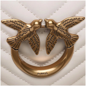 Elevate your style quotient with the PINKO matelassé shoulder bag – a true emblem of sophistication. Crafted from luxurious calfskin, this white stunner boasts an intricate bird detail that adds a touch of unique glamour. With a flap closure secured by magnetic buttons and a versatile leather and metal strap that’s both adjustable and removable, it epitomizes practical elegance. Whether worn crossbody or on the shoulder, the bag ensures your essentials are neatly organized with an internal zip pocket. Measuring 26×12.5×5 cm, it’s the perfect accessory for the fashion-forward individual.