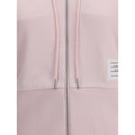 Pure cotton Sweatshirt by Thom Browne, featuring an adjustable drawstring hood and a double-slider front zipper closure. The design features raglan sleeves, two side welt pockets and a logo patch applied to the front. Finished with high ribbed cuffs and hem, it is enhanced by the iconic contrasting bands along the side panels, the brand’s signature detail.