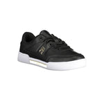 Elevate your athleisure ensemble with the epitome of sports-chic – Tommy Hilfiger’s lace-up sneakers. These shoes are a fusion of style and sustainability, crafted with a blend of 30% recycled polyester, 40% leather, and 30% polyethylene. Adorned with striking contrasting details and the iconic Tommy Hilfiger logo, each step reflects your eco-conscious fashion sense and love for the brand’s classic American cool aesthetics. Stride in confidence and make a statement in these black sneakers that blend comfort with a bold fashion-forward appeal.