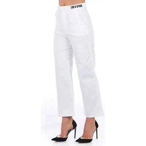 Elevate your wardrobe with the impeccable tailoring of Frankie Morello’s Cropped Trousers. Impeccably crafted in Italy, these high-waist trousers feature a streamlined multipocket design, combining functionality with sleek fashion. The crisp white hue makes a bold statement, while the cotton and elastane blend ensures comfort and a figure-flattering fit. They close securely with a zip and button, promising both style and substance for the trend-setting individual.